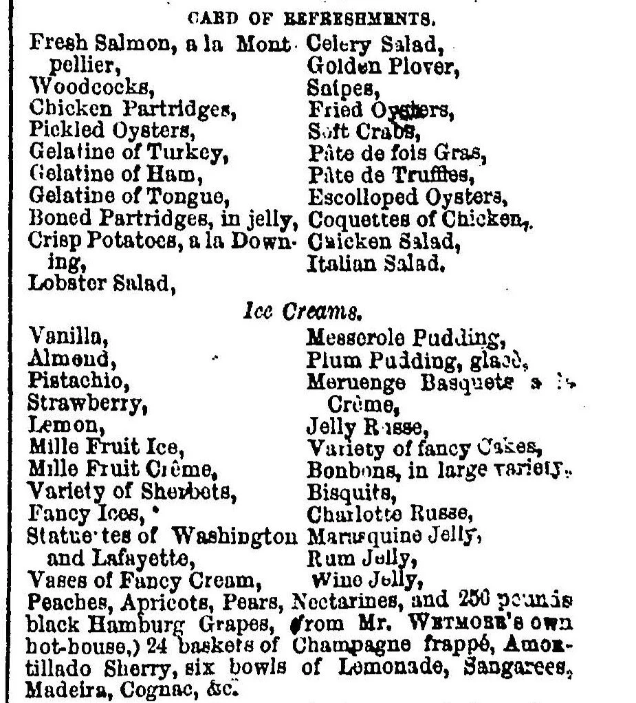 According to the New York Times, 3000 invitations were sent out and at least 2500 guests attended the party. “The Yacht Squadron, numbering some forty yachts, lay in the harbor, and nearly all of the gentlemen belonging to the squadron were present for the occasion.” (New York Times, September 12, 1857.) The Yacht Squadron was that of the New York Yacht Club.